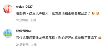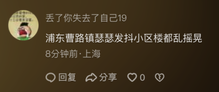許多上海網友表示:「浦東曹路鎮瑟瑟發抖小區樓都亂搖晃。」「家都出不去。」