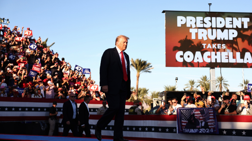 美國共和黨總統候選人、前總統川普,上週六(10月12日)來到號稱民主黨大本營的加州,在河濱縣科切拉市卡爾霍恩牧場出席競選集會。