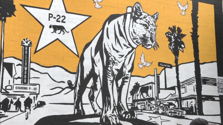 記者張博媛:「號稱『好萊塢明星』的美洲獅P-22是很多人的回憶,如今洛杉磯街頭又多了一幅壁畫,來紀念這種稀有動物。」