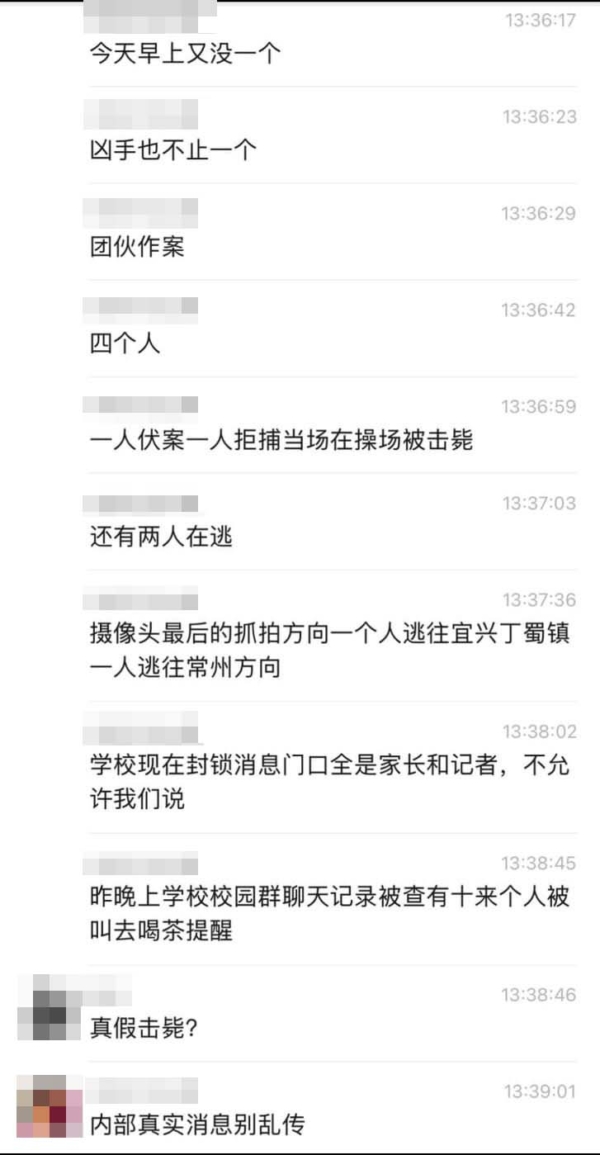 針對蘇州、常州和南京的高校凶殺案,當地網民熱傳,可能是16日無錫高校砍人案逃脫的凶犯繼續作案。許多網民的爆料以「殺到蘇州了」、「殺到常州了」、「他們殺瘋了」等開頭。