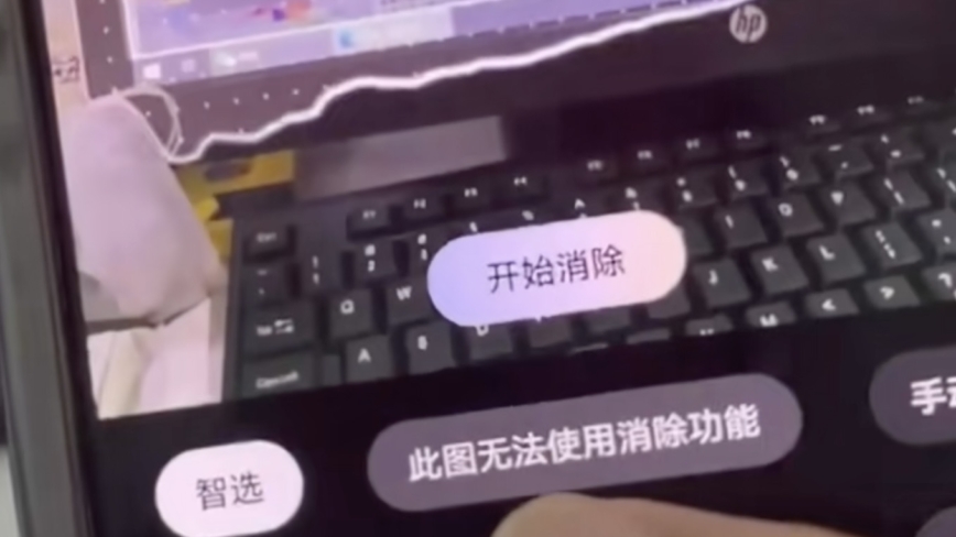 視頻顯示,一機主拿華為手機拍攝電腦上的中共五星旗圖片,然後使用手機內建的AI修圖功能,想要把中共五星旗消除,但是,當圖案快要完全消失時,下一秒突然又恢復原狀,手機還彈出提示說,「此圖片無法使用消除功能。」