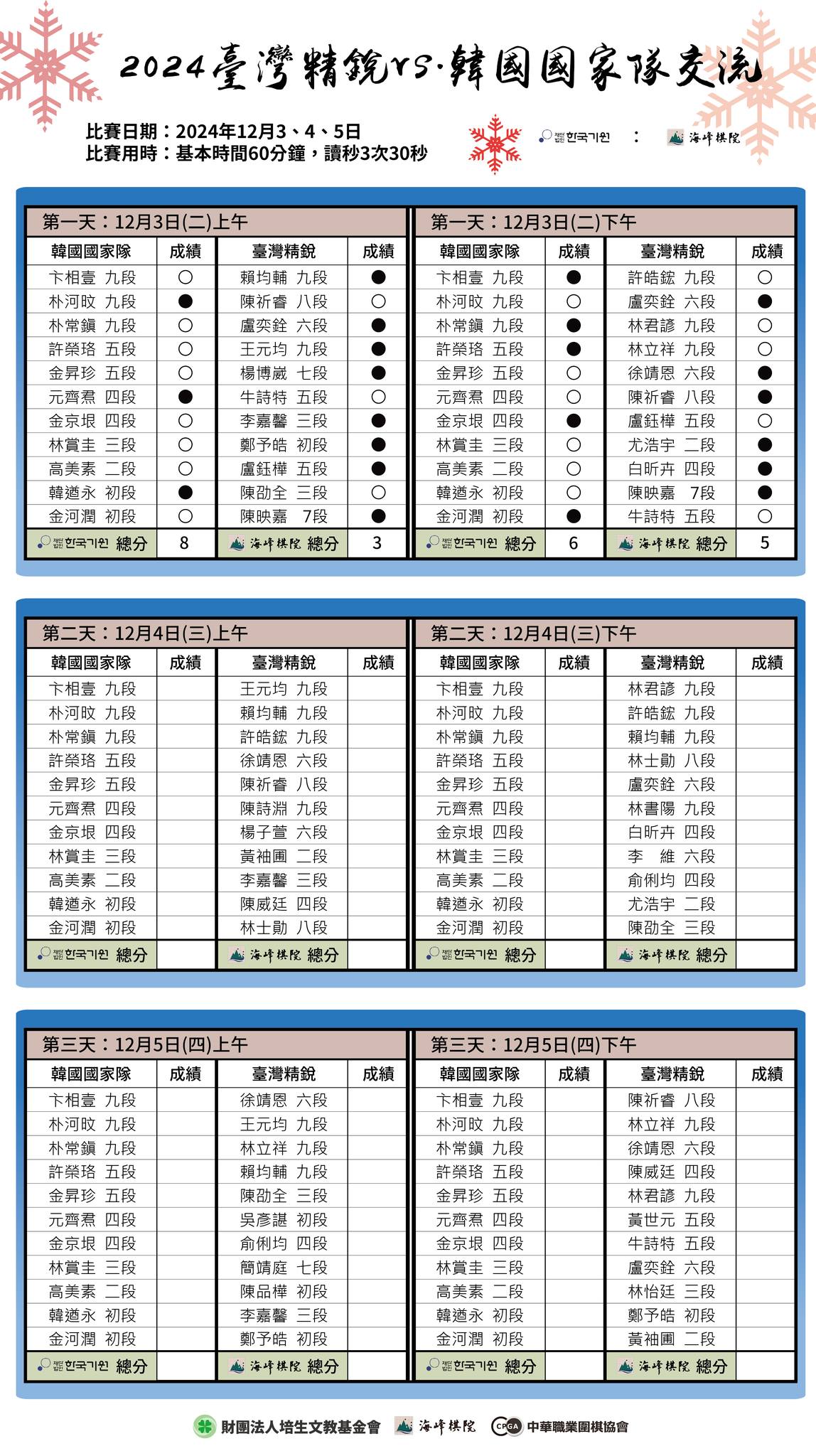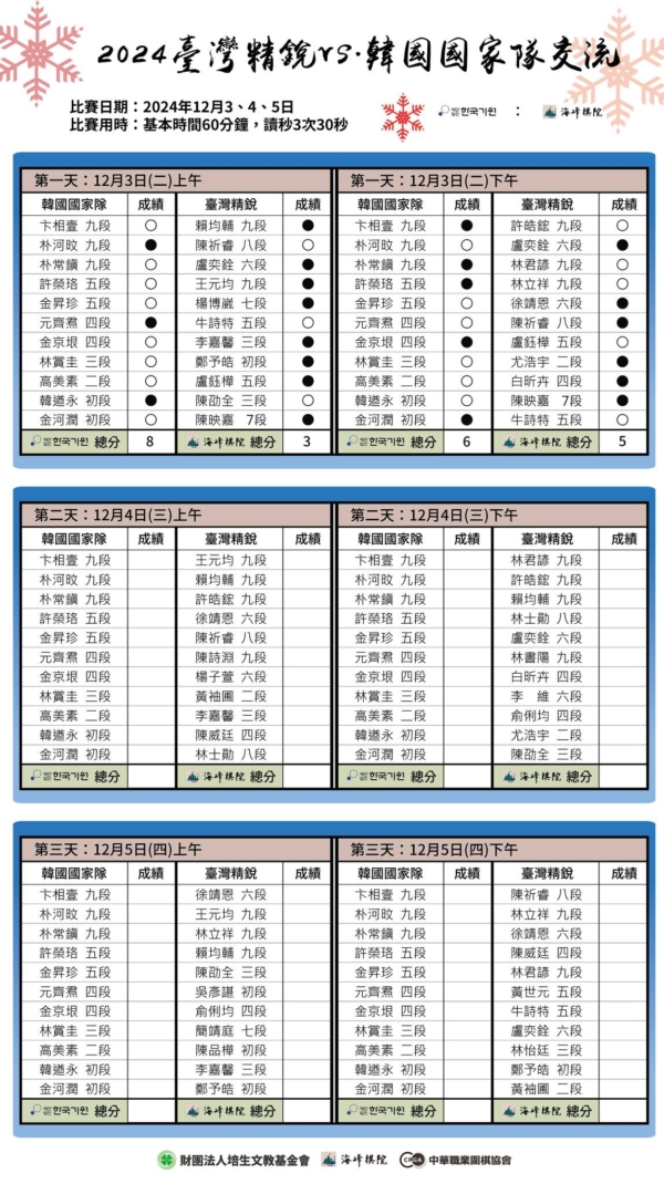 兩國交流賽計劃於12月3日至5日分三天進行。在首日兩回合對弈中,韓國國家隊以14:8暫時領先台灣精銳隊。其中,韓國世界冠軍卞相壹九段3日上午擊敗台灣世界冠軍賴均輔九段,但下午不敵亞運會金牌得主許皓鋐九段,取得1勝1負的戰績。其他棋手也都互有勝負。