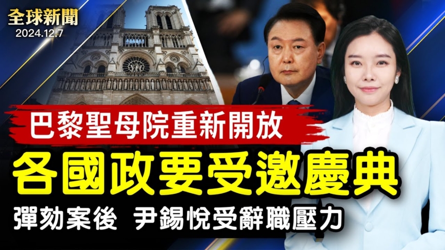 【新!唐!人:北京時間2024年12月08日訊】巴黎聖母院重啟昔日輝煌 各國政要齊聚慶典;韓國總統彈劾案未通過 尹錫悅仍受辭職壓力;敘利亞反叛直逼首都 川普認為美國不應插手;獨家:二十大前 習親定攻擊法輪功新戰略;比特幣破10萬美元 業者:「川普暴漲」將推動全球流通;唱詩班變67呎聖誕樹 密州高中40年傳統。