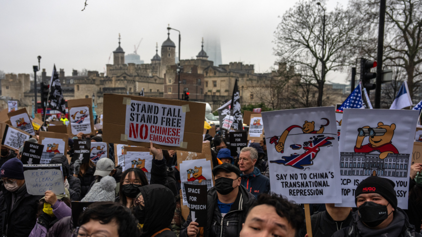 2月8日,超過一千名抗議者在倫敦前王家鑄幣廠外集會,反對中共在此興建「超級大使館」的計劃。
