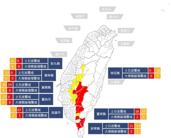 依農業部農村發展及水土保持署資料,高雄計67條土石流紅色警戒,23條土石流黃色警戒,1處大規模崩塌紅色警戒及3處大規模崩塌黃色警戒。高雄市政府民政局表示,截至中午12時,桃源、茂林、那瑪夏、六龜及杉林5區,撤離人數共計2007人。