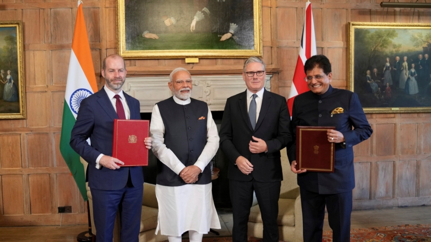 7月24日,英國與印度在倫敦的英國首相官邸丘克斯(Chequers),正式簽署歷史性自由貿易協定,涵蓋威士忌、汽車、紡織品等,降低關稅並擴大市場准入。雙方預計一年內完成各自國內批准程序。根據該協議,兩國在2040年前提升貿易額255億英鎊(約340億美元)。兩國談判歷時三年,今年5月完成文本。