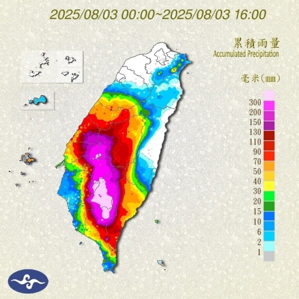交通部中央氣象署表示,預估今(8月3日)晚至明天(4日)苗栗以南、金門地區仍然有短延時豪雨;今天截至下午3時,台南累積雨量582毫米,高屏也都超過450毫米。