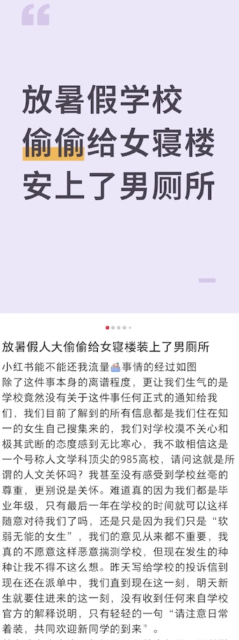 據眾多人民大學學生在網絡發帖透露,2025年8月(暑期),中國人民大學在未提前通知「知一宿舍樓」原住女生的情況下,將該樓由純女寢改為「男女混住宿舍」。男生入住樓層(低層)加裝小便池等男性設施,女生通過施工痕跡才發現改造意圖。