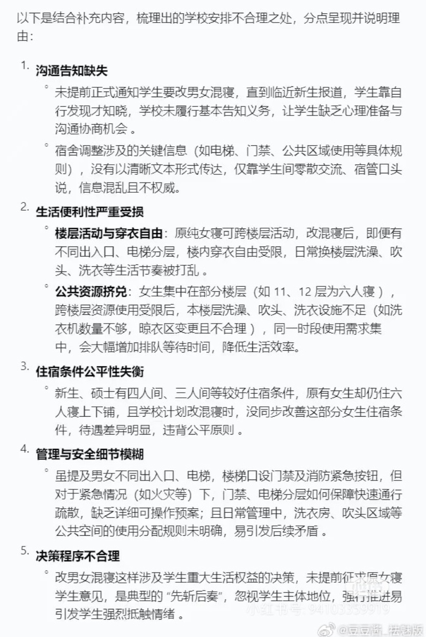 網友評論說,「到底是誰用屁股想出來的男女混寢?每年就招生那麼些人,後來還有新校區建成,不至於宿舍不夠用吧?」「還以為只有你們雙非才這德行,投訴信寫得有理有據就拿處分畢業證來威脅。!」「這種大環境 誰敢住男女混住的寢室樓啊」「這學校前科多得很,真是惡臭。」「男女混寢瘋了嗎,很不安全啊,男的偷拍咋辦?」「國內沒有聖土,名校都一個樣,我在北京一個top院校,前兩年爆出來一個女廁偷拍男,學校直接冷處理,女同學反應都沒用」。
