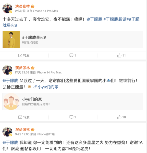 前一天,張林說,「于朦朧,我知道你一定能看到的!還有這麼多星星之火努力在燃燒!謝謝TA們!限流刪帖都沒用!一切阻力都TM是紙老虎!」