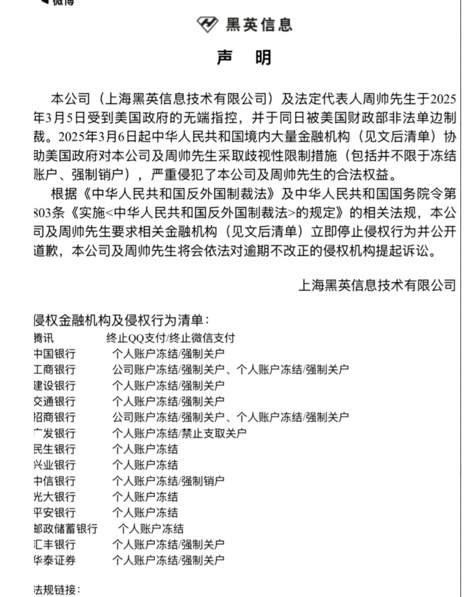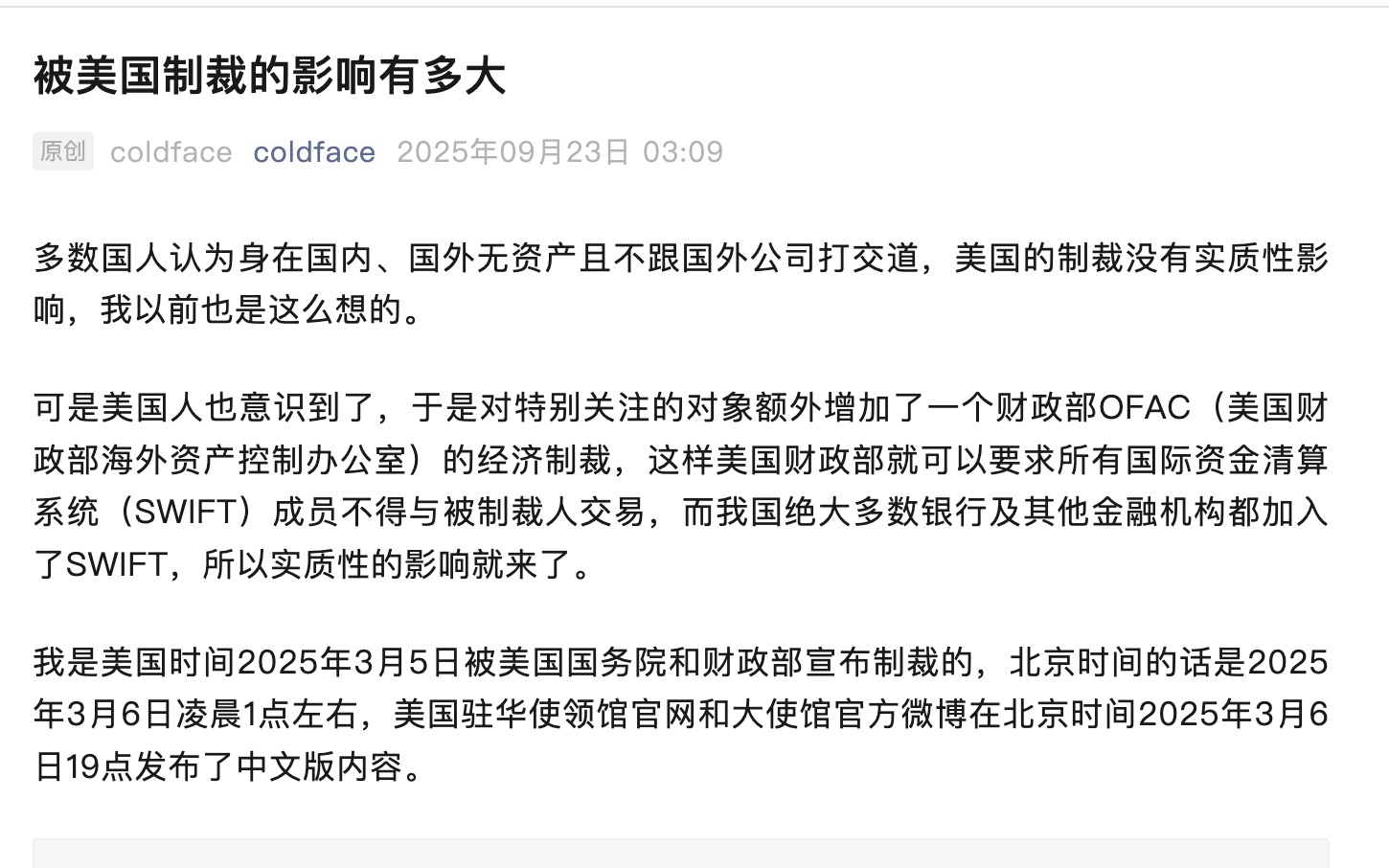 9月23日,微信公眾號「coldface」發文《被美國制裁影響有多大?》文章稱,多數國人認為身在國內、國外無資產且不跟國外公司打交道,美國的制裁沒有實質性影響,他以前也是這麼想的,但是被美國制裁後,後果卻完全出乎他的意料。