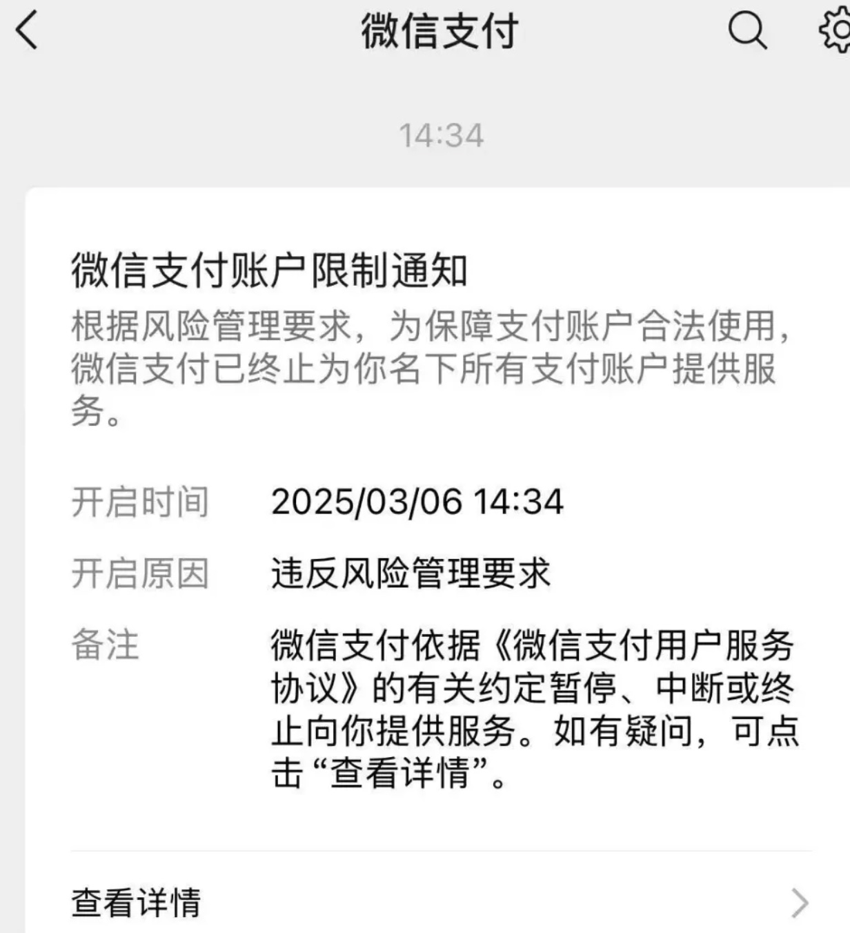 他最早受到的通知來自騰訊,3月6日14點半,他受到一個微信通知,告知他終止為他提供支付服務,後來他發現QQ支付也終止了。