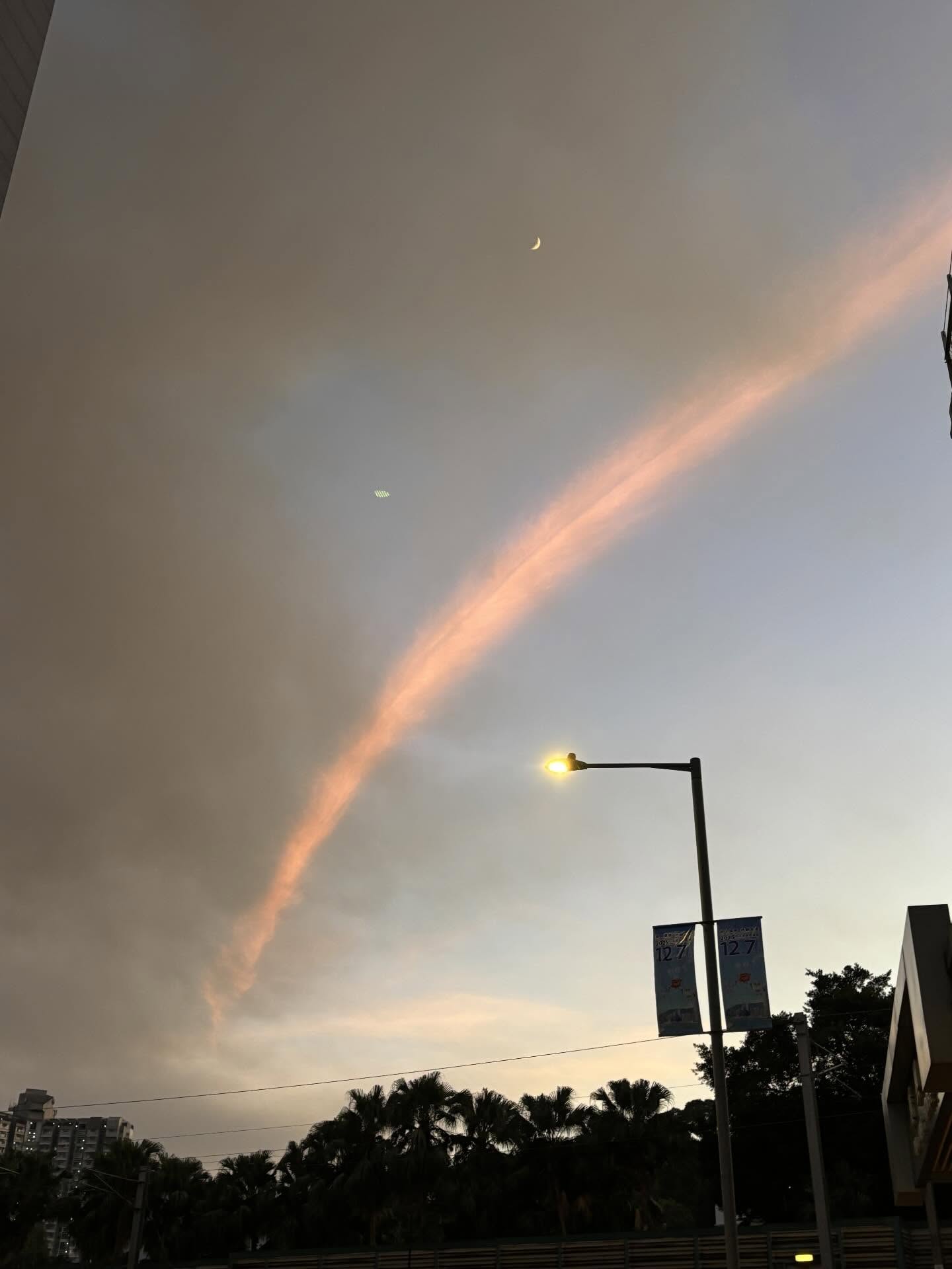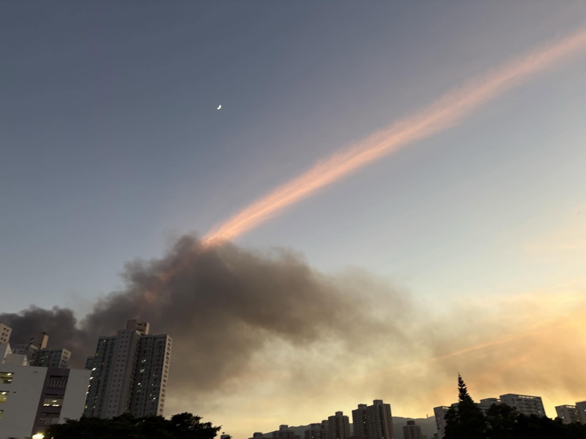有網友表示,當日下午,受到火災波及的建築物產生大量濃煙。隨著地面風向與高空風場作用,濃煙被拉伸成一條長長的煙帶,並在夕陽光線的照射下呈現粉紅與橙紅色調。