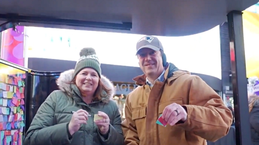 記者宸熙:「一年一度的——新年許願牆終於揭幕了,我已經迫不及待的寫下了我的新年願望。這裡的每一張彩色紙條,都寄託著人們對新一年的期許。它們將在跨年夜的午夜時分,隨著3000磅的彩紙一起,紛飛在紐約時代廣場的天空。」