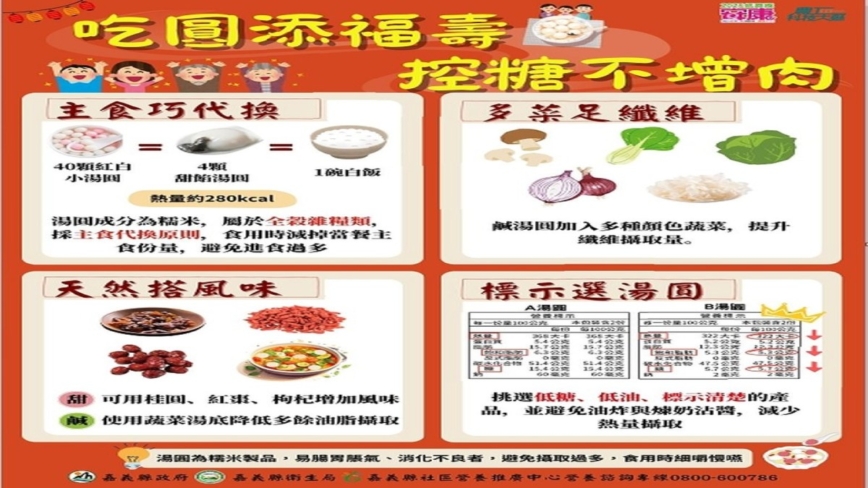 【新!唐!人:北京時間2025年12月18日訊】嘉義縣社區營養推廣中心推出「吃圓添福壽 控糖不增肉」健康吃湯圓四招,一、湯圓替換主食適量進食,二、加入蔬菜提升纖維,三、選擇天然食材搭風味減少糖油攝取,四、看懂標示聰明挑選產品。讓大家在溫馨的節氣中,也能吃得健康又安心。