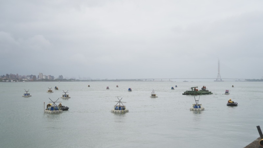 第三作戰區進一步表示,油桶內均注入一定容量燃料,並依縱向、橫向固定間距配置,以發揮有效爆破半徑,針對敵氣墊艇形成殺傷效能;浮動平台除運用遙控引爆機制外,亦結合地雷觸發設計,當敵方裝備接觸後即能引爆炸藥,確保在不同作戰情境下均能遂行任務。