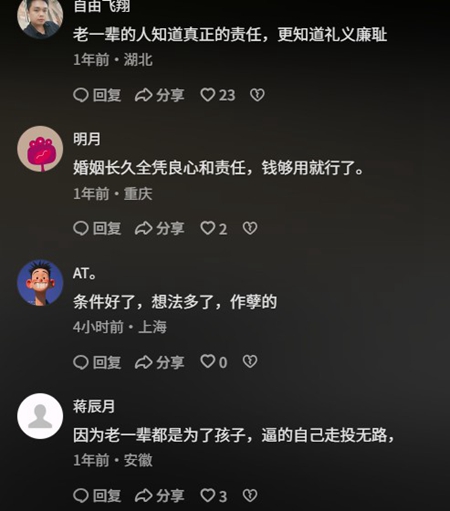 對於這種不斷升溫的離婚潮,有網友認為是現代生活觀念造成的,「老一輩的人知道真正的責任,更知道禮義廉恥」,因為老一輩都是為了孩子,自己忍氣吞聲過一輩子。