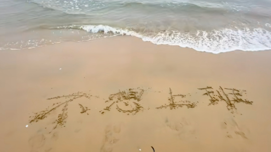 中國網友「大黑丫頭」2月22日發布視頻,因為長假即將結束,她在沙灘上寫下「不想上班」4個字,表達心聲。沒想到,一個海浪過來,直接把4個字改成了「小心一點」,令她忍不住直呼「太好笑了!」