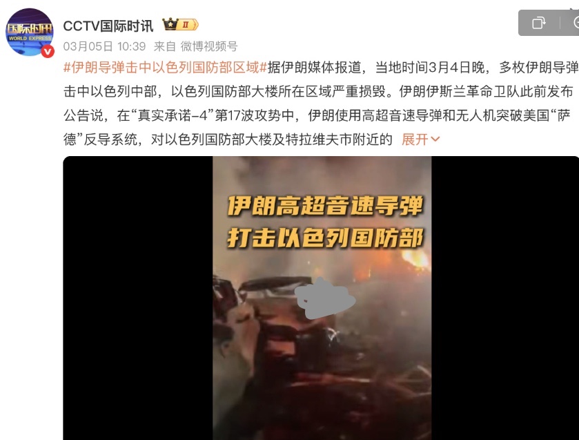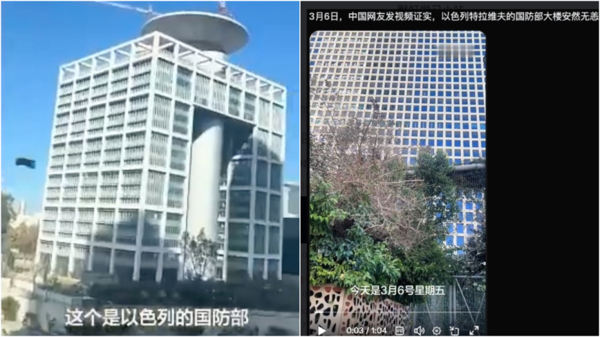 中共央視及多家官媒援引伊朗媒體的報導,聲稱當地時間3月4日晚,多枚伊朗導彈擊中以色列中部,以色列國防部大樓所在區域嚴重損毀。報導還配以所謂的視頻和圖片。
