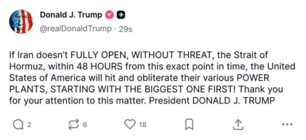 美國總統川普在Truth Social上再度發文,警告若伊朗未能在48小時內「無任何威脅」的全面開放荷莫茲海峽,美國將「徹底摧毀各座發電廠,從最大的那座開始」。