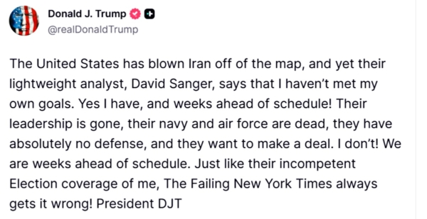此前,川普總統還表示已經「把伊朗從地圖上抹去了」,而且比計劃「提前了好幾週!」。他表示,伊朗的領導層垮台了,海軍和空軍都完全沒有了防禦能力,卻還想與美國談判。他指出,他不會與伊朗政權做交易!