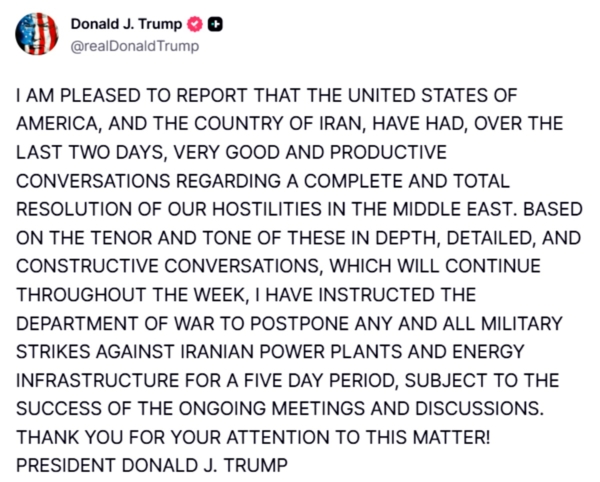 此前,川普曾威脅若伊朗不在週一(23日)晚間前重新開放霍爾木茲海峽,將「徹底摧毀」該國的發電廠。伊朗則在週末對以色列及海灣國家發動襲擊作為回應,並威脅將採取同等報復,攻擊能源基礎設施,並在「整個波斯灣」布設海軍水雷。