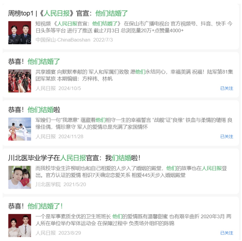 文章列出2025年人民網曾多次報導某體育明星「官宣結婚」,並列出人民網所屬官媒《人民日報》也曾多次報導「官宣結婚」。