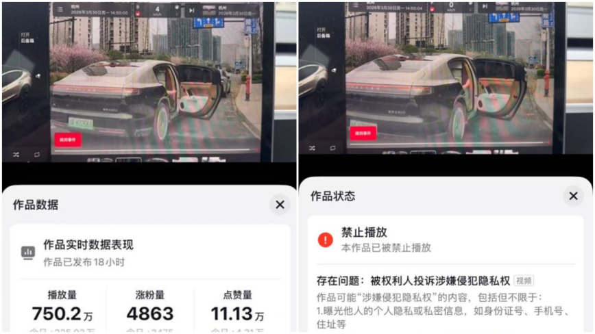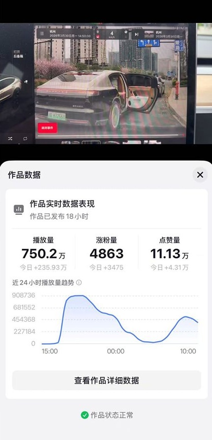 還有截圖顯示,該視頻發布18小時後,獲得750萬流量,逾11萬點贊。