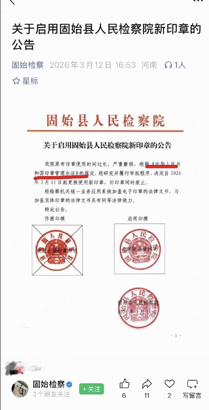 河南固始縣檢察院於上個月發布「關於啟用固始縣檢察院新印章的公告」,公告中提及,原有印章使用時間過長,嚴重磨損,根據《中華人民共和國印章管理辦法》,經履行審批程序,決定在2026年3月11日起更管使用新印章,舊印章同時廢止。