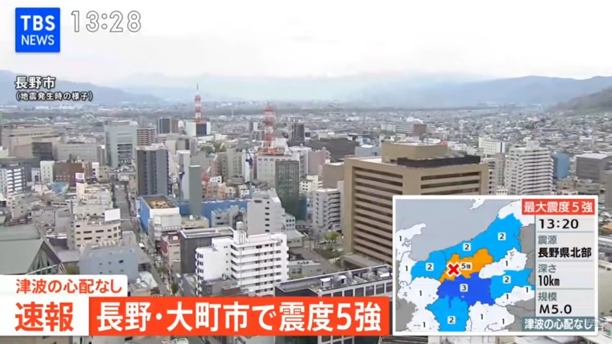 日本TBS電視台與日本放送協會(NHK)報導,長野縣北部今天下午1時20分許(台北時間中午12時20分)發生推估規模5.0的地震,大町市觀測到最大震度5強。周邊地區也觀測到震度1到3不等的搖晃。