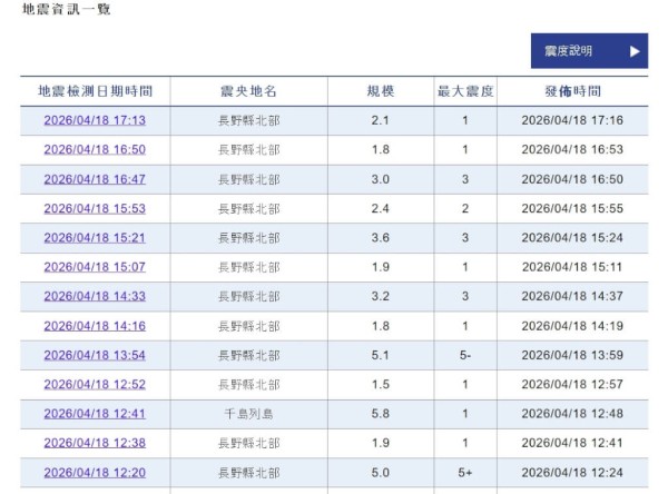 【新!唐!人:北京時間2026年04月18日訊】日本長野縣今天(4月18日)稍早接連發生地震,長野縣大町市觀測到最大震度5強。氣象廳指出,「震央附近有活斷層帶,若發生大地震,可能會出現震度6強以上的搖晃」,呼籲民眾留意。