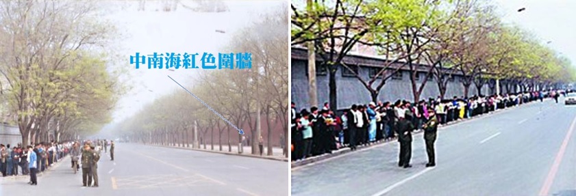 上面的左圖:「人」字表示法輪功學員在警察的指揮下所站的地方,處在中南海的西邊和北邊,而中南海南邊的正門——新華門、東邊根本沒有法輪功學員。