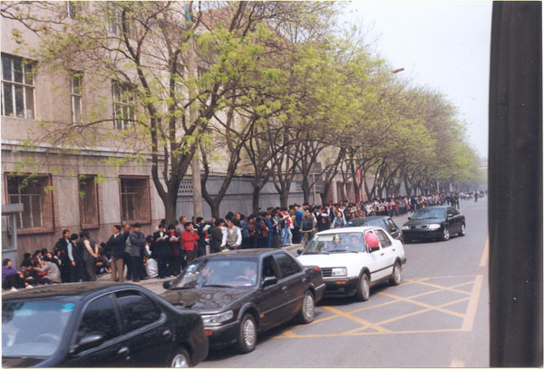 4月25日早上6點多,在國務院信訪辦附近的西安门大街人行道的两边已站满了法輪功学员,許多是頭天晚上趕到那兒的外地法輪功學員。不一會兒警察過來把那裡的法輪功學員引走,他們都很順從地跟著往府右街方向走。