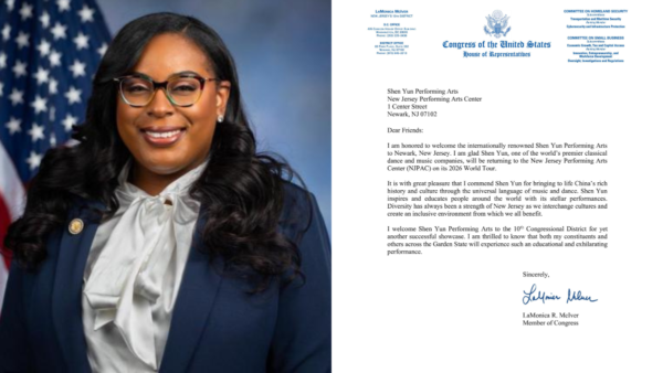 新澤西州第十選區聯邦眾議員拉莫妮卡‧麥克艾弗(LaMonica McIver)女士在賀信中說,「我非常榮幸地表彰神韻,透過音樂和舞蹈這種世界共通的語言,將中國豐富的歷史與文化生動地展現出來。神韻以其卓越的演出,啟發並教育了世界各地的人們。」