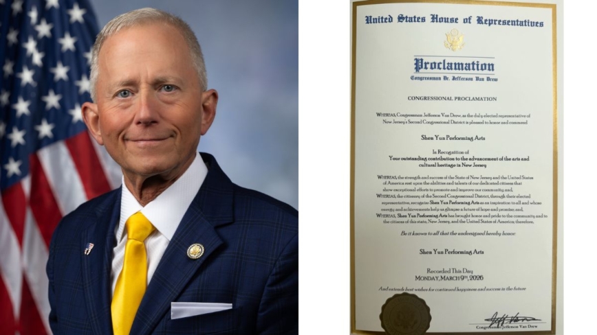 新澤西州第二選區聯邦眾議員傑斐遜‧范德魯(Jefferson Van Drew)先生在褒獎信中說,「神韻藝術團激勵了大家,她的能量與成就讓我們看到未來的希望與憧憬;為社區、為新澤西以及美國帶來了尊榮與驕傲。」