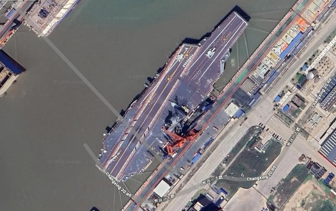 2026年4月24日,谷歌地圖顯示中共航母「福建艦」停靠在上海長興島造船廠的船塢內,與3月份的位置相同。(谷歌地圖)