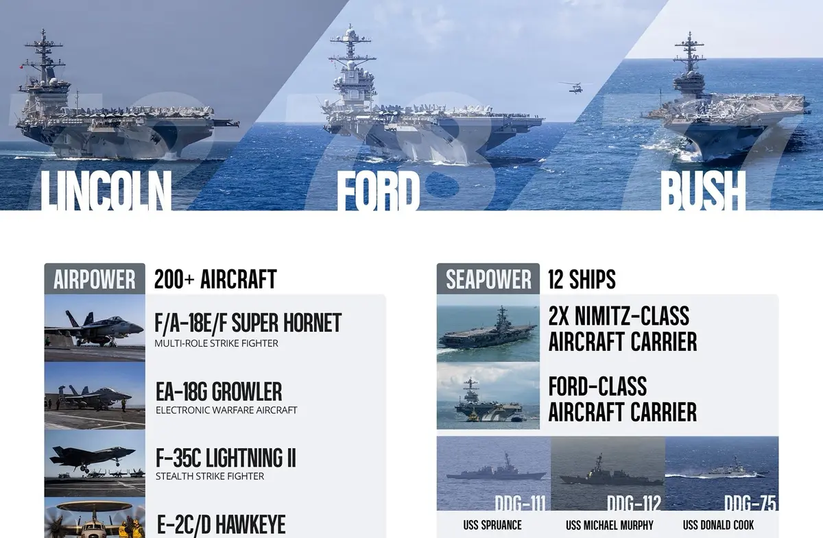 美軍三艘航母部署在中東, 是伊拉克和阿富汗戰爭以來的首次,顯示美國準備制服伊朗的決心。這三艘航母也可以在數日內抵達西太平洋,與常駐日本的「華盛頓號」航母匯聚,完成四航母部署。
