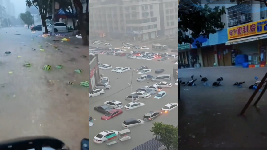 視頻顯示,欽州某小區門口,積水已沒過共享單車的車座,居民只能蹚水出行,部分區域水深在短時間內上漲超過半米。視頻中一處廣場處,積水越來越多,最後沖破攔擋物,形成落差水流將一處臨建房沖毀。