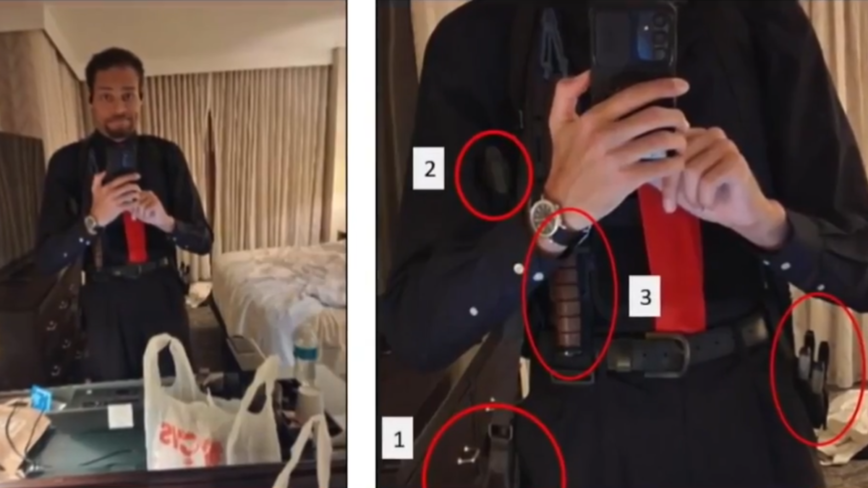 【新!唐!人:北京時間2026年04月30日訊】據檢察官近日公布的一張照片顯示,在白宮記者晚宴中開槍的男子,事發前曾在飯店房間內拍了一張全副武裝的自拍照。從照片中可以看到,嫌犯帶著一個裝有彈藥的小皮包、槍套、一把收在刀鞘裡的刀,以及兩把鉗子。這些物品都與後來在他身上查獲的武器相符。據官方資料,這張自拍是在事發當晚約8點03分拍攝的。