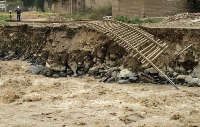 南美洲的秘鲁狂下3天豪雨,引发暴洪,土石流不断。图为,铁路路基遭冲毁。(CRIS BOURONCLE/AFP/Getty Images)