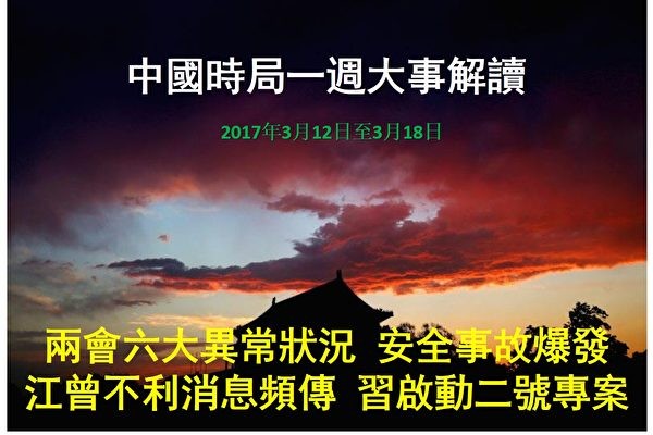 上周(2017年第11周;3月12日至3月18日),江泽民及其家族不利消息频传;习当局启动“二号专案”,瞄准曾庆红。中共两会期间,新疆团媒体开放日张春贤罕见缺席,公安部常务副部长傅政华举止异常等状况迭出;安全事故诡异密集爆发。中共两会异常沉闷的表象之下暗潮汹涌。