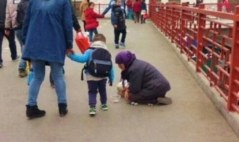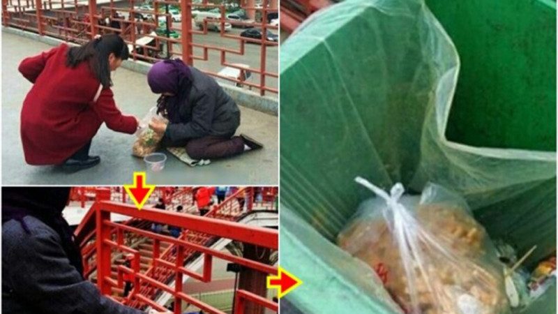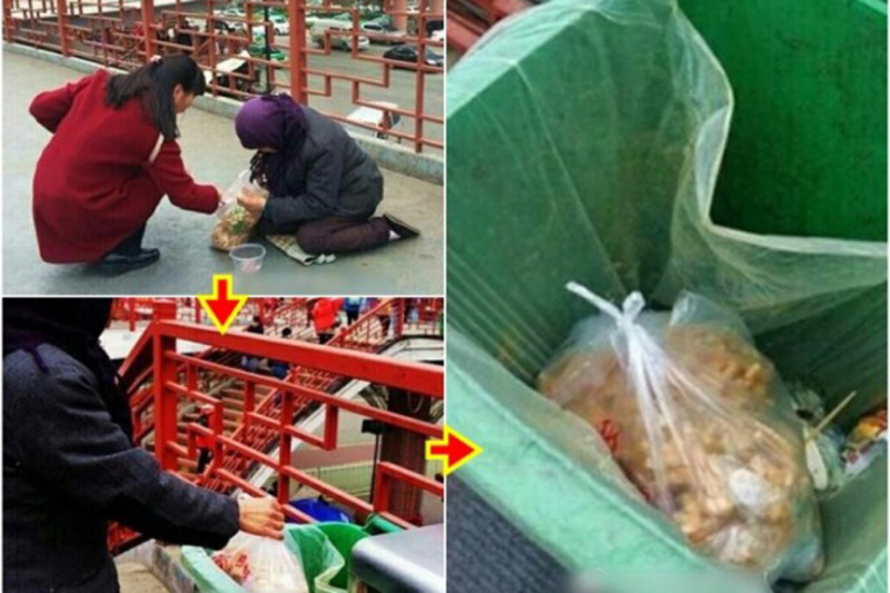 这位女子走了以后,过了一会,这名乞讨的老妇人做出了一个令人愤怒的动作:把好心女子送给她的麻花扔进了垃圾桶。