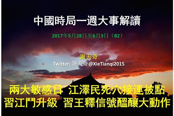 上周(2017年第23周;6月4日至6月10日),连逢“六四”与“610”两个敏感日,中共前党魁江泽民参与“六四”天安门屠杀及迫害法轮功两大罪行被外界聚焦。曾任国保局长的中共公安部副部长陈智敏被免职;体制内学者朱清时院士谈论气功和修炼话题;习当局清洗政法系统,释放清算涉政变将领信号。敏感时点,中国时局暗潮汹涌,江泽民多个死穴被触及。
