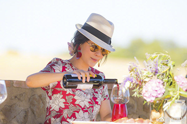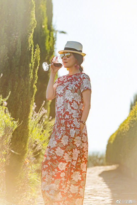 【新!唐!人:北京时间2017年08月22日讯】香港女星刘嘉玲近期晒出一组品红酒的照片。她身着一袭红色花朵图案的长裙,在葡萄园举杯徜徉,显得浪漫优雅,幸福满溢。向梁朝伟告白“嫁给了爱情”的她透露,在风雨中两人坚守30年,现在只靠听声音就能辨别对方的情绪。