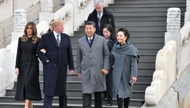 美国总统川普夫妇访华首日,11月8日下午抵达北京后,中国国家主席习*近*平夫妇陪他们共同参观了明清两朝皇帝的宫殿——紫禁城,两国元首夫妇沿着故宫中轴线,依次参观了太和殿、中和殿、保和殿、故宫文物医院、畅音阁、敬胜斋等。
