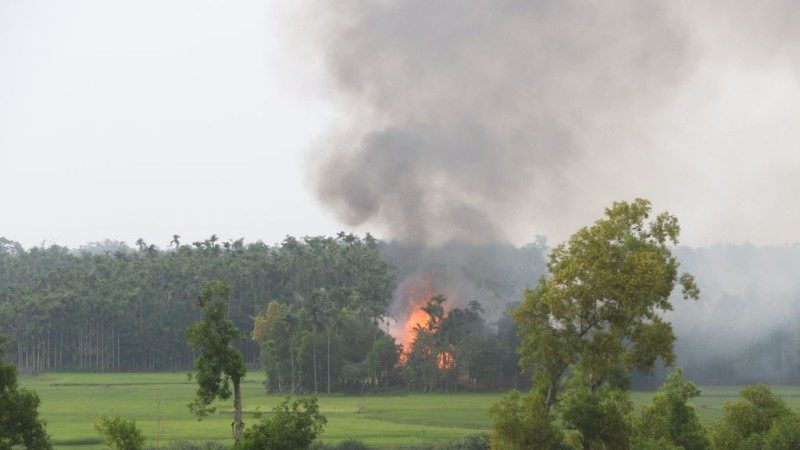 图为,2017年8月31日,缅甸洛兴雅人被烧毁的村庄。(STR/AFP/Getty Images)