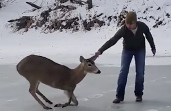 没想到,男子灵机一动,用两只手分别抓起鹿的两个前腿,跟鹿跳起来“探戈”,就这样一摇一摆地带着鹿走向冰湖的边缘。