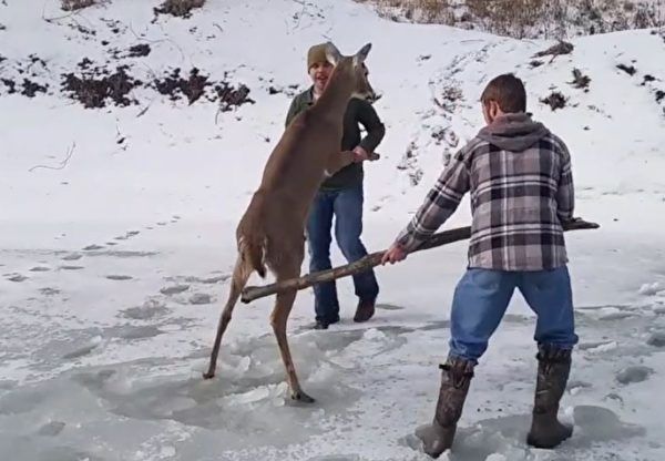 3名男子显然并没有预料到自己竟然会遇到鹿陷在冰湖的情况,所以他们什么可以利用的工具都没有。