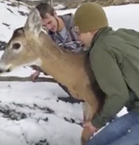就在这个时候,外出找工具的那位同伴回来了,他找到了一根粗壮的树枝,正好可以在后边保护鹿的后腿,不让它因为后肢无力而摔倒。