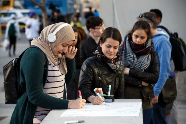 加拿大多伦多周一(4月23日)下午,一辆白色面包车高速开上人行道冲击路人。图为人们含泪签纪念卡。(Cole Burston/Getty Images)